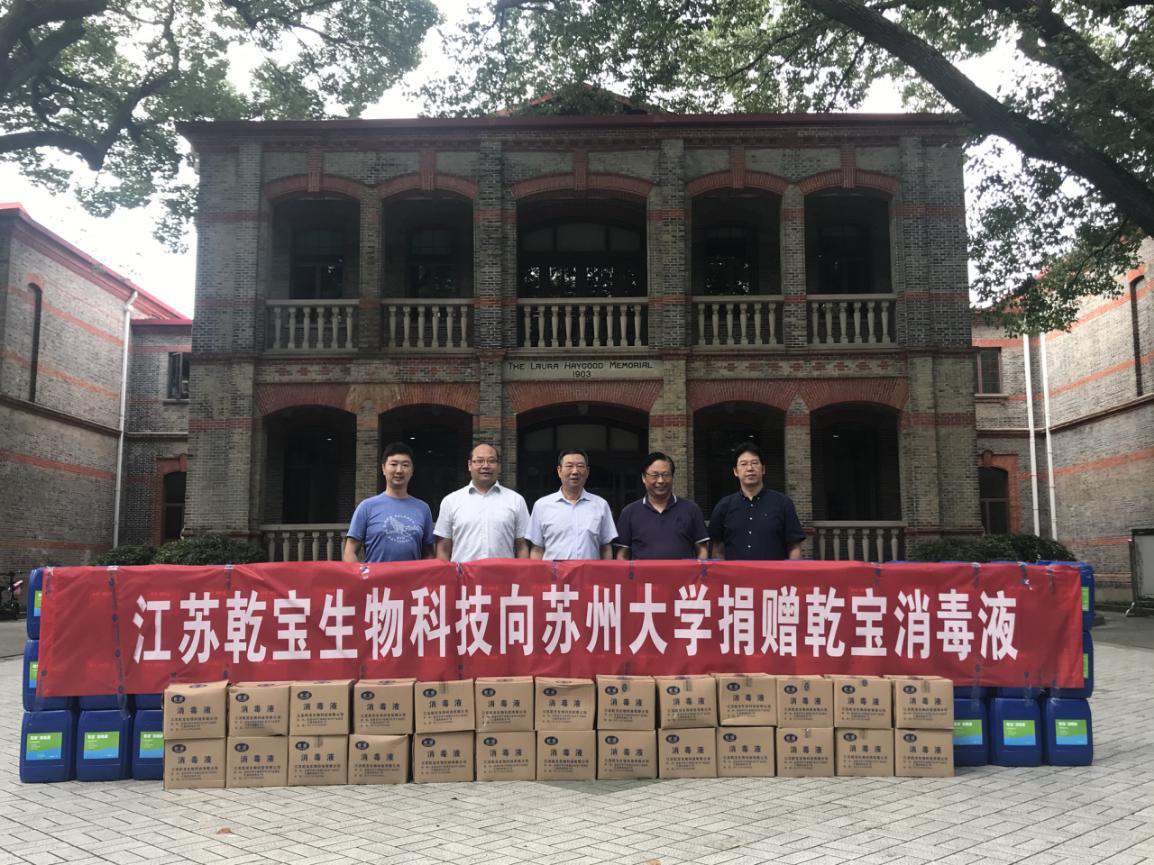 開學季來臨,高校疫情防控受到各界廣泛關注。為幫助高校做好常態(tài)化疫情防控,有序開展新學期防疫工作,2020年9月4日,愛心企業(yè)江蘇乾寶生物科技有限公司向蘇州大學捐贈了255桶20L裝乾寶安全環(huán)保消毒液和1650瓶300mL裝消毒噴霧,共計5噸,全力保障學校的校園環(huán)境衛(wèi)生和師生的健康安全。蘇州大學黨委副書記劉標,黨委常委、總會計師周高,后勤管理處處長王云杰以及江蘇乾寶集團總裁王翼寧、江蘇乾寶生物科技總經(jīng)理助理姚志光參加捐贈儀式。