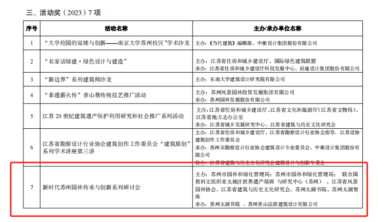 在此次優(yōu)秀成果評選中,蘇州太湖書院、蘇州太湖智庫、蘇州香山法原建筑設(shè)計有限公司聯(lián)合申報的“新時代蘇州園林承傳與創(chuàng)新系列研討會”榮獲“活動獎”。
