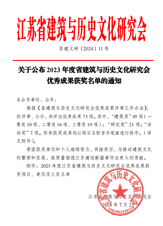 2024年7月25日,省建筑與歷史文化研究會公布了2023年度省建筑與歷史文化研究會優(yōu)秀成果獲獎名單。經(jīng)評審、公示,共評出優(yōu)秀成果 73 項。其中,“建筑獎”45 項(一等獎 10 項、二等獎 16 項、三等獎 19 項);“研究獎”21 項;“活動獎”7 項。其中,蘇州太湖書院、蘇州太湖智庫榜上有名。