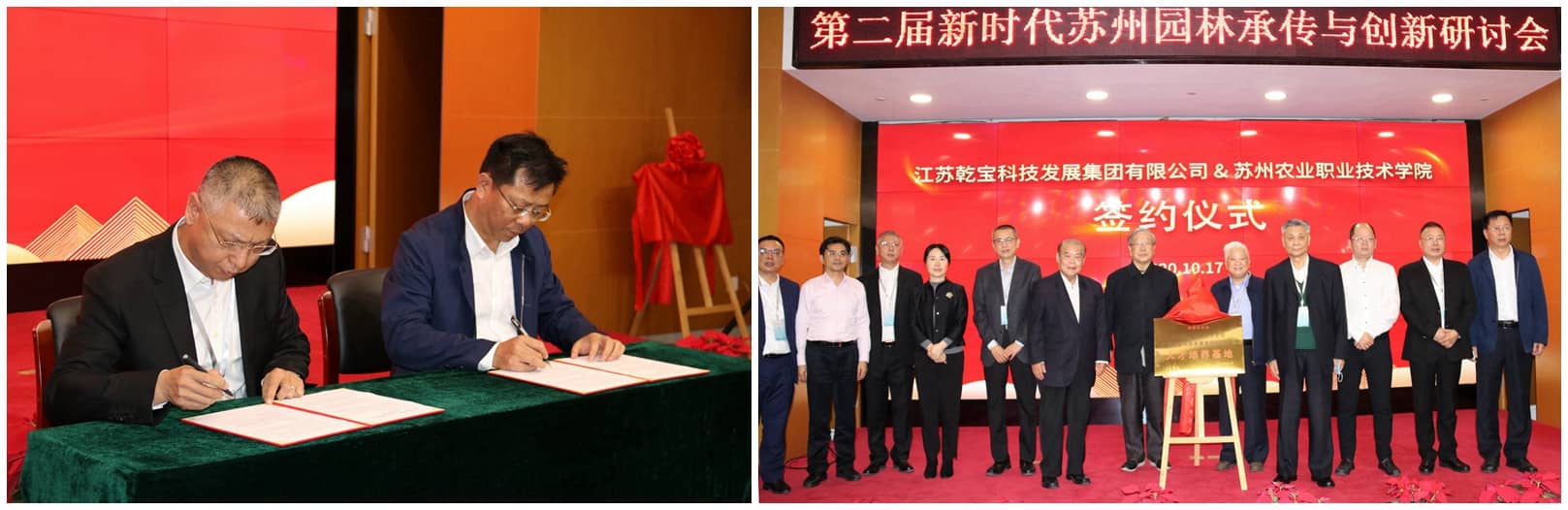 為了破解蘇州園林產(chǎn)業(yè)人才的短缺瓶頸,蘇州農(nóng)業(yè)職業(yè)技術(shù)學(xué)院和江蘇乾寶科技發(fā)展集團有限公司簽訂了“園林人才校企合作培養(yǎng)基地共建協(xié)議”,并為基地揭牌。