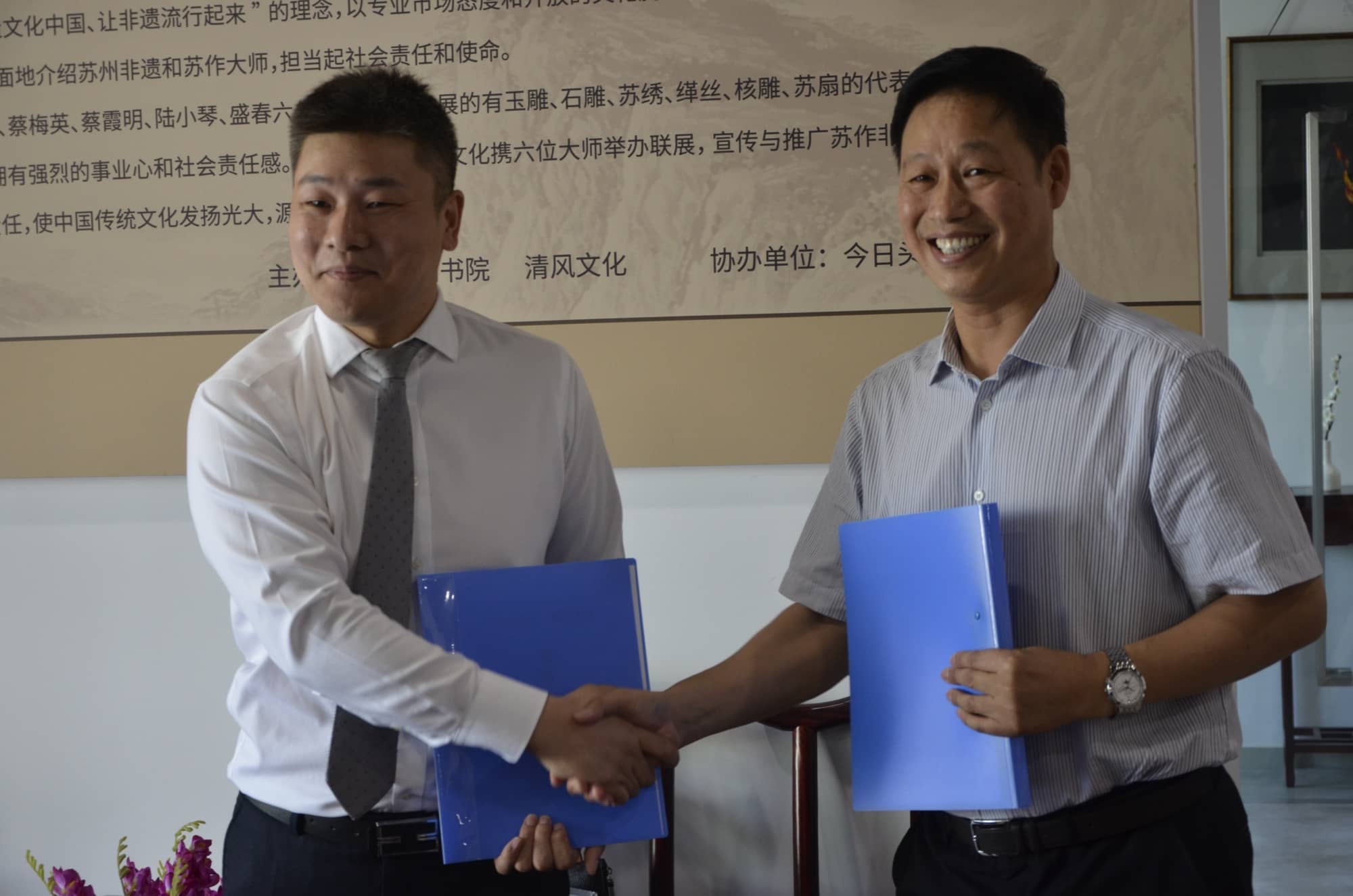 ?????? 2017年9月18日上午10點,太湖書院攜手清風(fēng)文化舉辦了非遺精品展覽,拉開了太湖·清風(fēng)與眾多非遺大師合作的序幕。江蘇乾寶投資集團副董事長朱波主持了揭幕儀式。參加此次非遺精品展的大師有蔡云娣,蔡梅英,蔡霞明,陸小琴,盛春,孫永等。嘉賓有江蘇乾寶投資集團董事長王躍程,陜西清風(fēng)文化產(chǎn)權(quán)交流服務(wù)有限公司總經(jīng)理李寶庫,太湖書院執(zhí)行院長沈陽,江蘇乾寶投資集團執(zhí)行總裁王翼寧、常務(wù)總裁王榮華,今日頭條、蘇州區(qū)房產(chǎn)運營總經(jīng)理張會來,江蘇乾寶投資集團副總裁徐正強,太湖書院副院長丘東,陜西清風(fēng)文化產(chǎn)權(quán)交流服務(wù)有限公司、清風(fēng)非遺博物館館長任元鴻,蘇州大學(xué)教授費湘軍,陜西清風(fēng)文化產(chǎn)權(quán)交流服務(wù)有限公司產(chǎn)品總監(jiān)陸洋,陜西清風(fēng)文化產(chǎn)權(quán)交流服務(wù)有限公司市場總監(jiān)黃蕊卿,西安大唐古玩市場總經(jīng)理唐亮等出席了展覽活動。太湖書院執(zhí)行院長沈陽、清風(fēng)文化非遺博物館館長任元鴻、非遺傳承人代表蔡梅英老師先后發(fā)表熱情洋溢的致辭,都希望通過此次活動弘揚主族律,傳播正維量,齊心協(xié)力把中國傳統(tǒng)文化發(fā)揚光大。儀式上,大師們?yōu)樘骸で屣L(fēng)文化非遺傳承保護合作基地揭牌,共同見證了乾寶文化與清風(fēng)文化戰(zhàn)略合作的簽約儀式,活動取得了圓滿成功。