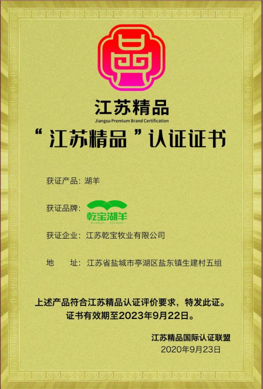 受省質(zhì)量委委托的江蘇精品國際認(rèn)證聯(lián)盟專家,此前,對(duì)“乾寶湖羊”申報(bào)“江蘇精品”標(biāo)志進(jìn)行認(rèn)證。通過對(duì)企業(yè)創(chuàng)新發(fā)展、質(zhì)量卓越、品牌引領(lǐng)和社會(huì)責(zé)任四大類數(shù)十項(xiàng)指標(biāo)一一對(duì)照考核和質(zhì)量保證能力檢查,最終以較高得分通過認(rèn)證,從而躋身首批50家“江蘇精品”行列。