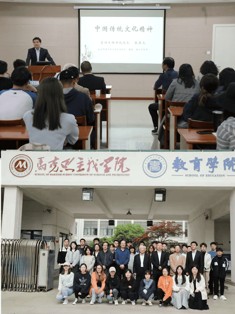 王騰教授在總結(jié)中表示,本次名家學(xué)術(shù)演講,與其說(shuō)是一次學(xué)術(shù)演講,毋寧說(shuō)是融合文、史、哲、藝為一體的一堂具有學(xué)術(shù)啟發(fā)意義的研究性示范教學(xué),尤其是古今貫通、中西互鑒的方法論對(duì)碩士研究生的教育教學(xué)、學(xué)術(shù)研究乃至人才培養(yǎng)具有較強(qiáng)的指導(dǎo)意義。講座結(jié)束后,張其成院長(zhǎng)欣然與蘇州科技大學(xué)馬克思主義學(xué)院哲學(xué)研究生合影留念。